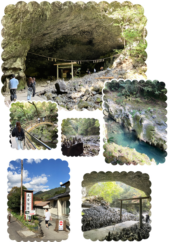 ここは天照大神(アマテラスオオミカミ)が岩戸にお隠れになった際、天地暗黒となり八百万(やおよろず)の神がこの河原に集まり神議りされたと伝えられる大洞窟。