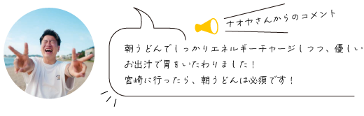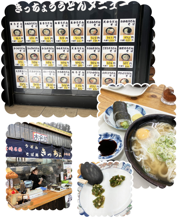 メニューも豊富で、その日の気分にあわせてあっさりからがっつりまで選べる。やさしい出汁とほどよい太さのもちもちとした麺で、宮崎のうどん!という感じ。